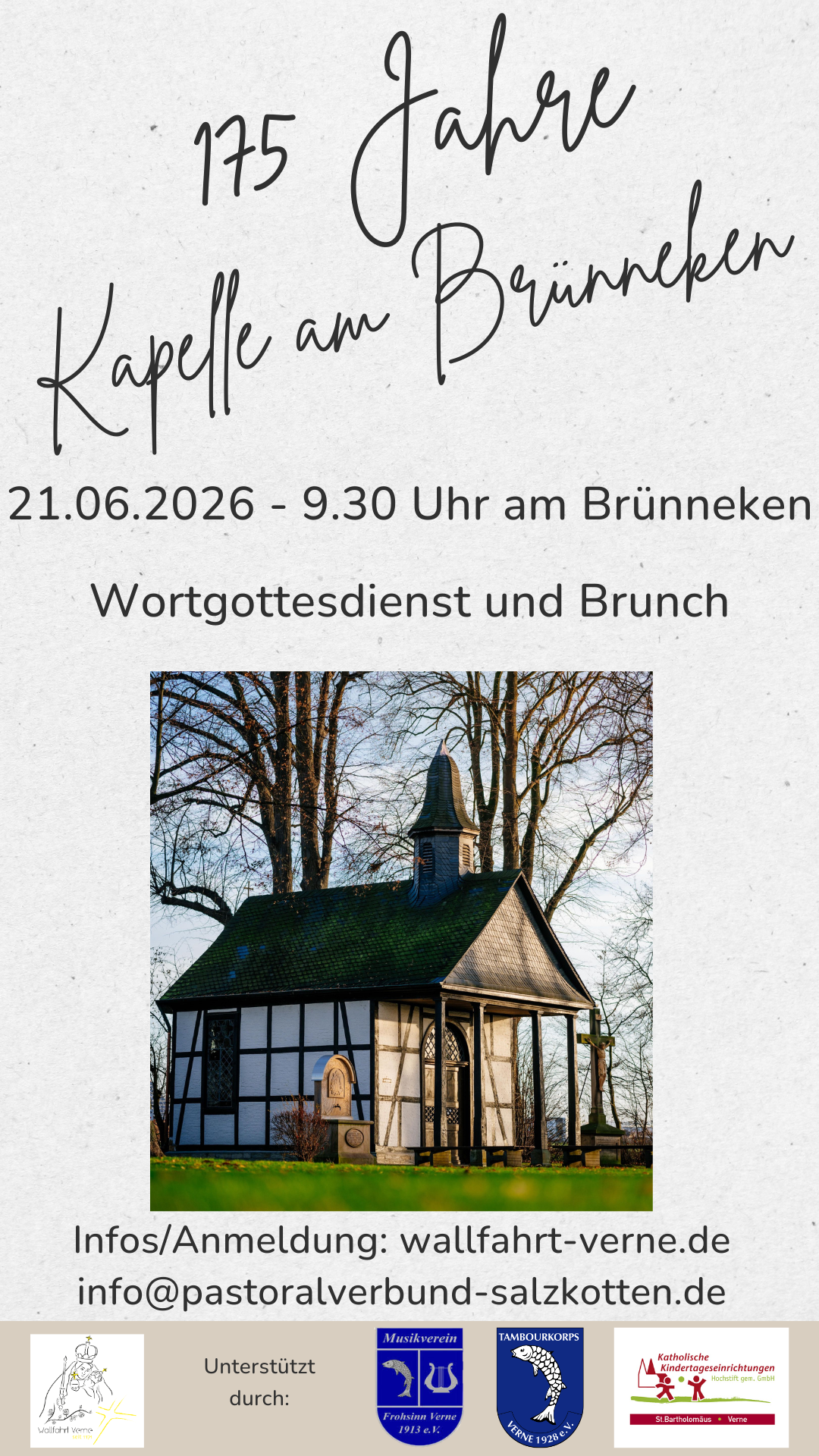 Bitte beachten Sie auch die Terminhinweise für weitere Höhepunkte im Jahr 2026: Hier klicken! Am 30.05. Rundfahrt auf dem Pilgerradweg und am 21.06. Familienbrunch am Brünneken anlässlich 175 Jahre Kapelle